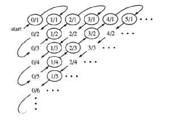 We obtain: \(0,1,1/2,2,3,1/3,1/4,2/3,3/2,4/1,\ldots\) Each nonnegative rational appears in this list exactly once. We now must insert in this list the negative rationals, and follow the same scheme to obtain: